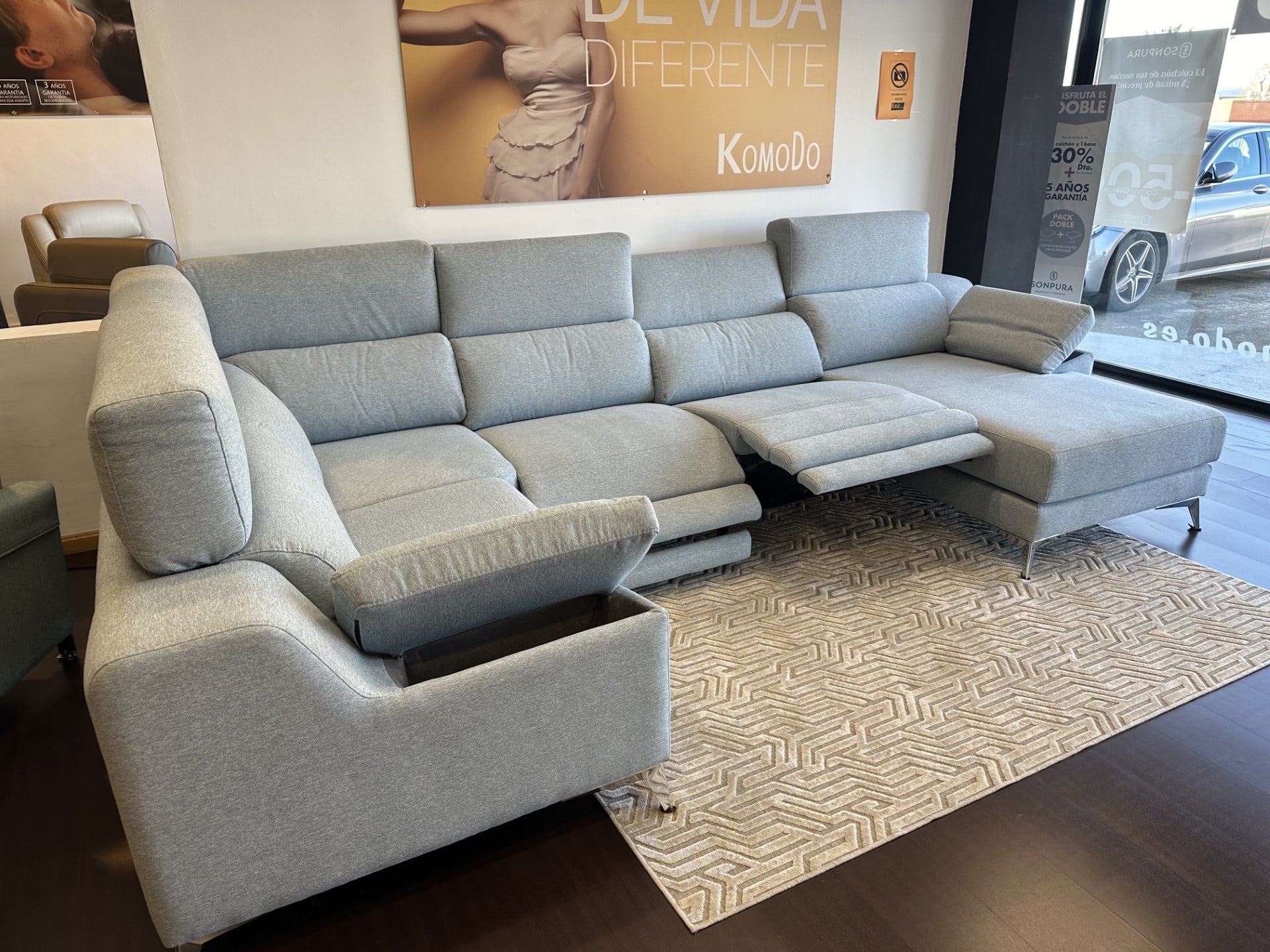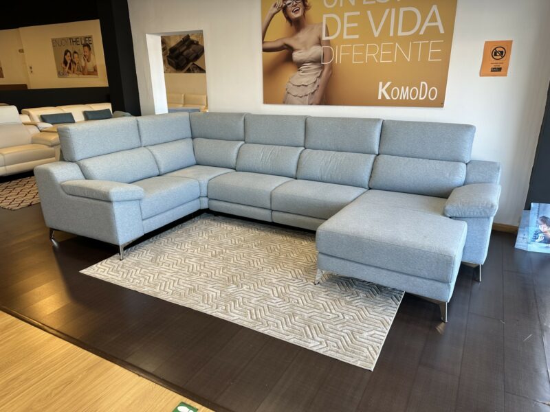 Rinconera con chaislongue con dos asientos relax electricos, arcones en los brazos grandes dimensiones, tela con tratamiento antimanchas a un precio unico.